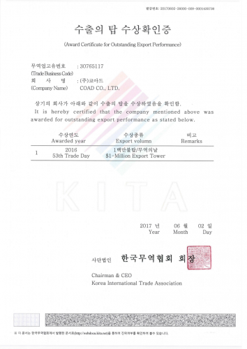- 수출의 탑 수상확인증