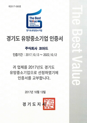 - 경기도 유망중소기업 인증서