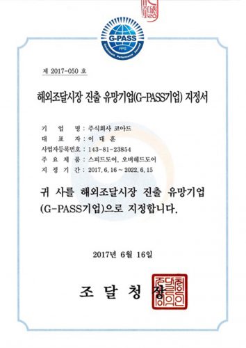 해외조달시장 진출 유망기업 지정서